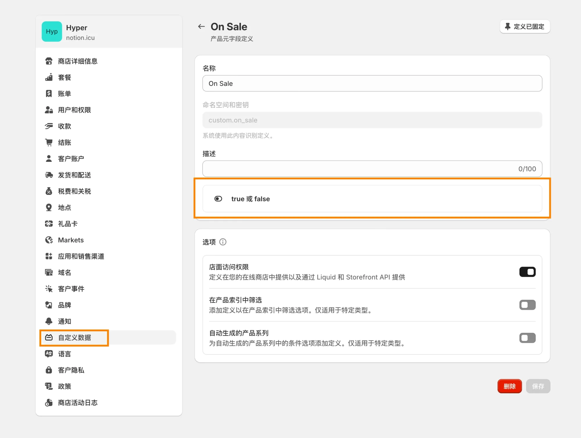 支持多种字段类型:单行文本、多行文本、布尔开关、颜色选取器、日期、日期时间、下拉选项(列表)、富文本(支持标题、列表、加粗、斜体、下划线、超链接)、各类引用类型(产品、集合、商品变体、页面、Metaobject、公司、客户等)。