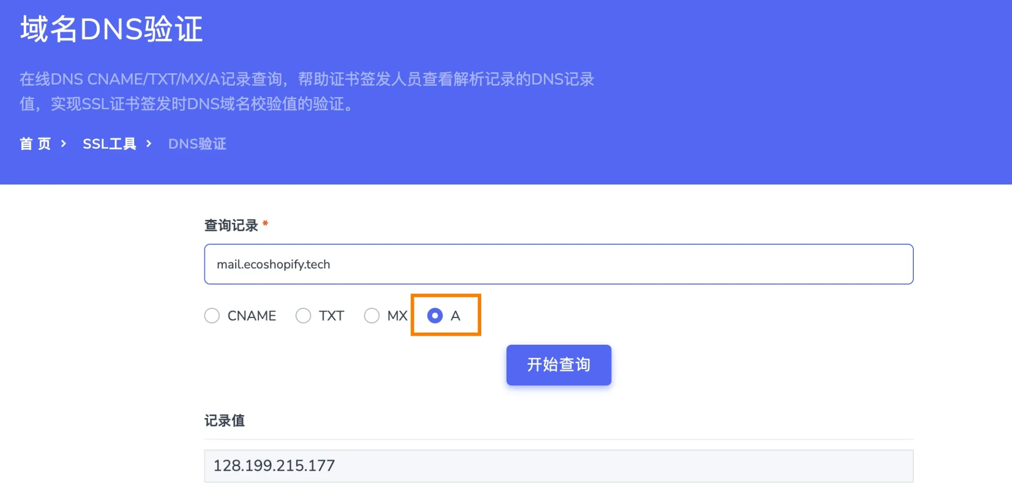 - 检查域名解析是否生效 输入域名-选择记录类型-点击开始查询