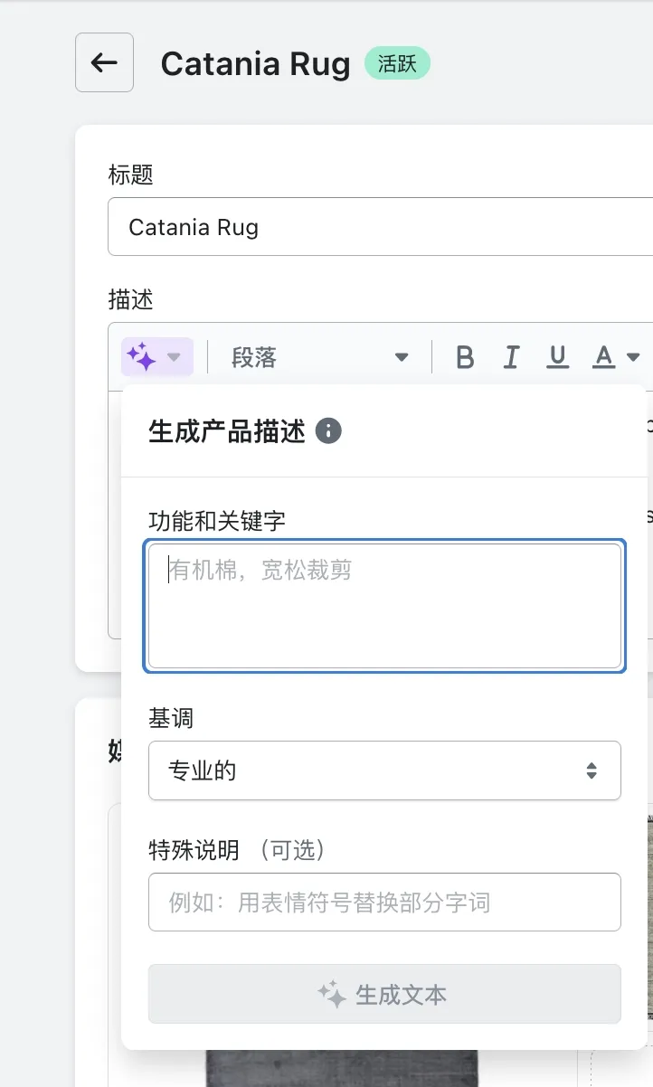 Shopify魔法:使用 Shopify Magic 免费帮你撰写不同风格的产品描述,帮助客户进行购买决策,并提升店铺搜索排名。